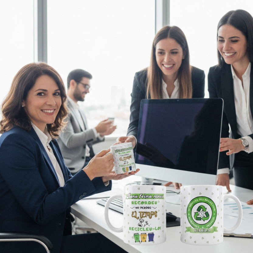 Cliente: Le queremos hacer un regalo a nuestra jefa, está obsesionada con el tiempo y el reciclaje. Queremos una taza chistosa.