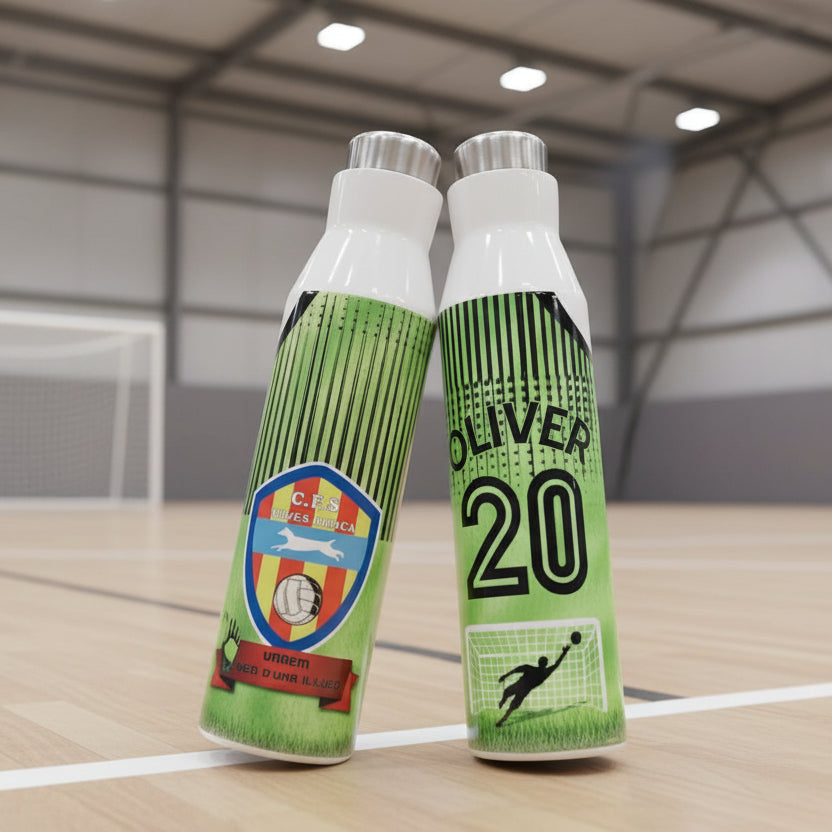 Cliente: Quiero una botella para mi hijo, el juega a futbol sala, es el portero, sería posible poner el escudo su número y su nombre.